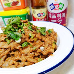 炒锅放油加入煨好的肉丝炒至变色再加入葱花、姜丝翻炒