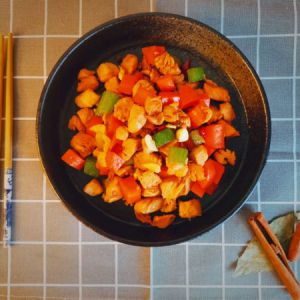 将鸡胸肉,胡萝卜,黄瓜,全部切丁备用