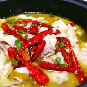 鱼片烫好后,鱼肉和鱼汤直接倒入酸菜鱼骨上面即可
