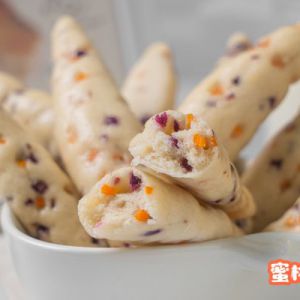 2.加入酵母,白糖,紫薯粒,胡萝卜粒,低筋粉搅拌均匀,揉成光滑的面团,搓成长条,再切成大小相等的小剂子(约20g/个)