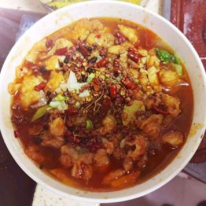 锅中倒入底油,放入郫县豆瓣,火锅底料炒香,倒入开水,然后开始溜鱼片,把鱼片全部放完加入鸡精,胡椒粉然后出锅,倒入刚才的菜碗里