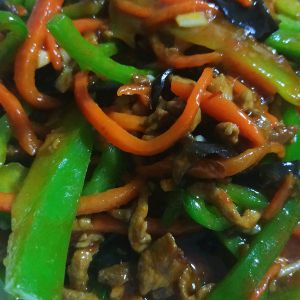 胡萝卜切丝开水焯一下,木耳泡发切丝,柿子椒切丝备用