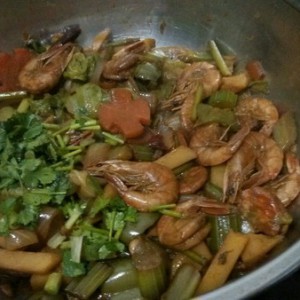 将备用蔬菜都放入锅内,放入适量老抽,生抽,盐,糖,翻炒一会儿,加入少量水,盖锅盖顿一会儿便可出锅。最后加香菜提味。