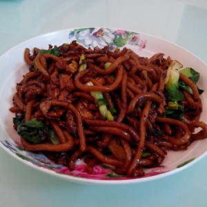 炒鸡蛋,放青菜翻炒,放面翻炒,放糖、酱油、孜然、白胡椒翻炒出锅。