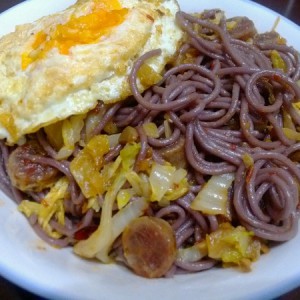 炒香后放入紫薯面条拌匀,起锅,我自己打了煎蛋在上边