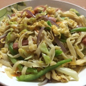 加入面条翻炒,淋入酱油,少许盐(因为面里加过了),适量糖,适量孜然,翻炒均匀,加入少许麻油,出锅!