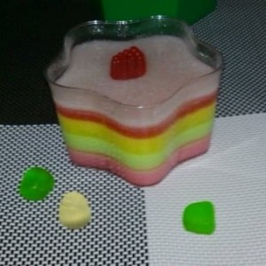 混合液冷却以后及时装入容器,盖上保鲜膜放在冰箱里保鲜大概十来分钟就凝结了。一个颜色做好凝结后按上述步骤进行其他颜色的操作。上图是做最后一个颜色时才想起拍照,哈哈,是不是几乎成品啦?