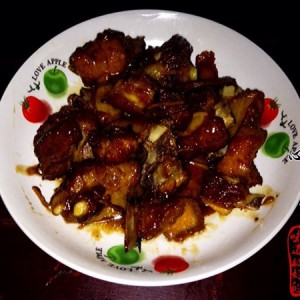 锅里倒入适量油,烧热后倒入排骨炸至色泽微黄;