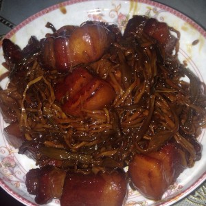 放肉炒色,在放蚝油, 酱油,香叶,葱段姜片少量,放事先泡好的笋丝和豇豆 ,炒匀上色。