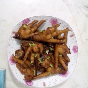 加入之前备好的白糖,如果有点糊锅可加入少量的水,待鸡爪变色后即可出锅(之前矛的时候可以火大点),再淋上葱花就OK了。