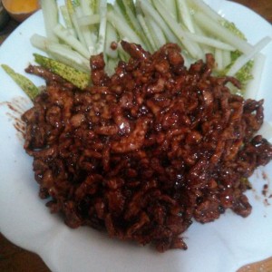 锅上放油,小火,放甜面酱炒一下把煸好的肉丝放入锅内翻炒,知道所有的肉丝均匀的粘上甜面酱为止,