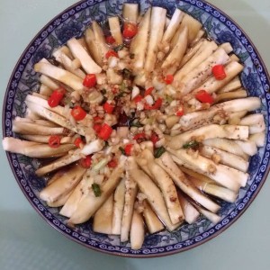 锅里面加水,把茄子放入锅内蒸10分钟左右拿出