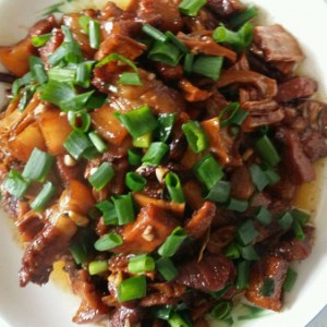 把五花肉用水煮熟,切块,煮熟是因为炖出来的肉肥而不腻,然后下锅炒,一定少放油,因为五花肉炒的时候会出油,炒到肉块变小放入冰糖把冰糖炒化,加入老抽,葱花,和所有调料,炒到有颜色加入啤酒,在加些水,炖半小时,加锁干,炖到只剩下油,出锅后加入蒜末,葱末!美味的下饭菜开始吧……