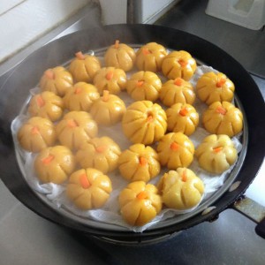 全部捏完划好印子后就插上胡萝卜做的南瓜把子