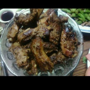 放入葱姜蒜和八角,放入热开水,开水到排骨的一半,大火后转小火,看看汤汁浓稠了就关火