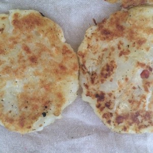 拿出来,弄成圆的,撒上葱花,火腿丁,放入倒一点油的平底锅中。金黄在翻过来继续。