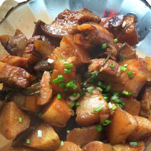 收汁后加入土豆块,再加水,放入葱段。酌量加佐料。收汁即可。