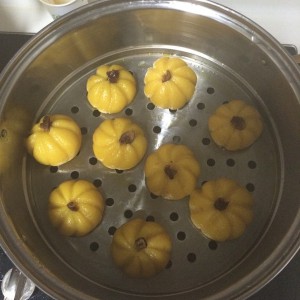 掐一小坨面团搓成汤圆,中间包一点压好的紫薯蓉,用陶瓷汤勺在表面压上南瓜印,用葡萄干或者红枣粒做南瓜蒂,放蒸锅蒸15分钟,记得蒸笼上刷点油防止沾锅!