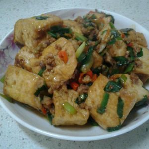 豆腐煎好后!开始在炒锅里放植物油适量!爆香辣椒、接着倒入肉沫!翻炒2分钟后加入韭菜炒至5分熟、倒入煎好的豆腐开始加盐、五香粉、2滴酱油!翻炒1分钟!装盘即可享用啦!和我一样爱吃的你、快快行动吧!