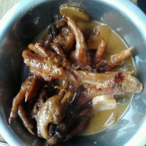 锅内放油糖,炒糖色,放入鸡爪翻炒上色,放入葱姜,生抽,老抽,料酒