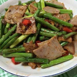 将大蒜、生姜末和瘦肉一起倒入锅中翻炒,至瘦肉变色。倒入蒜苔翻炒几下,添加鸡精豆瓣酱翻炒一分钟后出锅。