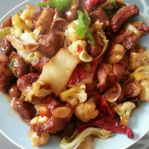 排骨焯水备用,油锅下白糖待糖沫落下下排骨,倒少许生抽。翻炒后加入葱姜蒜干辣子花椒和香料君们。加热水没过排骨闷煮十分钟。如果喜欢吃脆骨的可以用高压锅压20分钟,然后加入花菜闷十分钟。加入白菜和青椒。加适量盐,大火收汤即可!