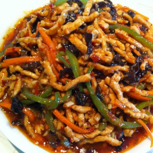 锅中倒油放泡椒末煸香出红油放一半葱姜蒜末后放肉丝木耳丝胡萝卜丝翻炒再放青椒丝后倒碗汁(少许酱油 一大勺醋 多半勺糖 水淀粉)翻炒均匀后放另一半葱姜蒜末即可出锅