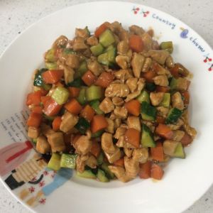 快要收汁的时候,倒入黄瓜丁,翻炒