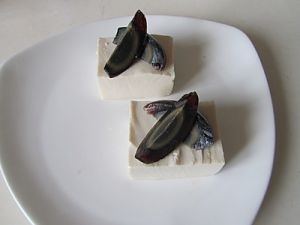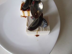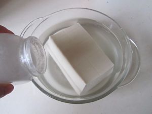 将豆腐放入加了盐的开水中泡上两, 三分钟;
