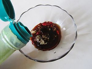 在小碗中放入适量的蒜泥, 蚝油, 红米椒, 盐, 生抽和胡椒粉;