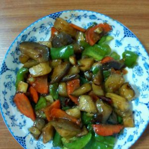 葱姜蒜切好。倒油入锅,烧到七成热,将葱姜蒜倒入炒出香味,倒入胡萝卜,翻炒至,五成熟时,倒入茄子,加入适量的糖。