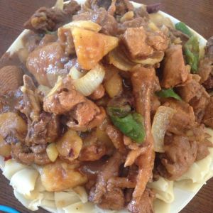 土豆炖好后放入尖椒和洋葱翻炒成熟即可,锅中汤汁浓稠但不要太少,因为要泡面片。拌入蒜蓉,将炖好的大盘鸡盛在面片上即可享用。