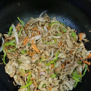 放入切好的尖椒,胡萝卜,洋葱,香菜。大火翻炒均匀。