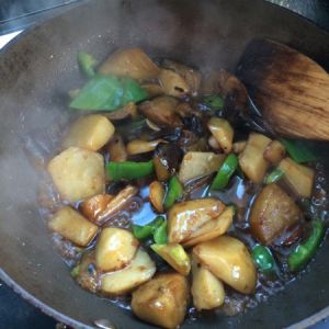 锅里剩一些油,再次开火,把葱姜蒜倒入锅内爆炒,然后再倒入盐,生抽,糖,如果愿意勾芡再勾芡下。随后倒入刚炒至金黄的土豆和茄子,另外倒入青椒,调小火,倒一点水,盖锅盖闷一会。