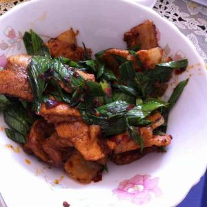 最后撒入青蒜段,快速翻炒均匀之后出锅即可。