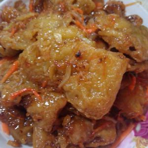 炸好的肉放置一旁,锅里放少量油,放入葱姜蒜爆香,放糖和醋(根据个人口味)放入胡萝卜丝圆葱丝翻炒,放鸡精,盐,酱油,放入炸好的肉,翻炒上色装盘