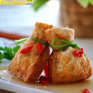 北豆腐切成宽4厘米、高5厘米、厚1.5厘米的块,中火炸至表面金黄捞出备用。