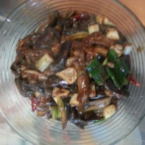 锅里倒入一点油,烧至五六成热,放入干辣椒,花椒,葱,姜,蒜爆香,倒入茄子,一勺糖,二勺黄豆酱,一勺蚝油,翻炒出锅!