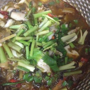 锅里放点油,注不宜太多,把之前切好的香料倒到锅里翻炒记下,之后再放些水,把鱼头放下去,盖锅