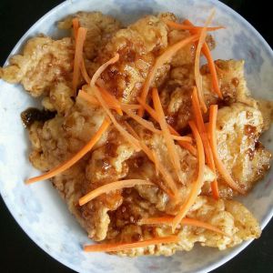锅里留少量油,放入葱姜蒜爆香,加入三汤匙陈醋和三汤匙白糖,可以加一点水,大火收汁,使酱浓稠后倒入之前炸好的肉片,用铲子把浓稠的汁在肉片上混匀,然后就出锅啦~可以撒上一点萝卜丝配色,更好看~