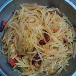 将炒熟的调料放入土豆丝中,再加入生抽、白醋、香油适量,搅拌均匀,即可上桌!!!