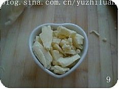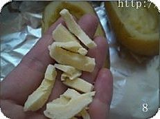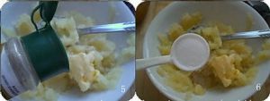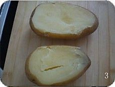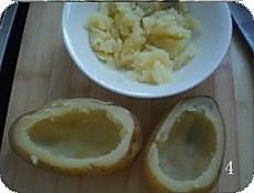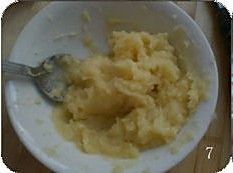 将挖出的土豆泥放碗中,加一小块软化的黄油,少许白胡椒粉,适量盐