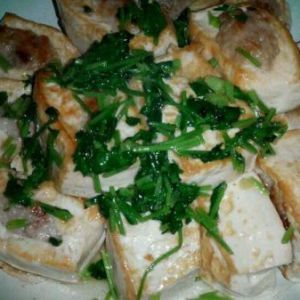 豆腐对半切开,酿入准备好的猪肉陷。放入冰箱冷藏两三个钟,这样煎起来不会碎。