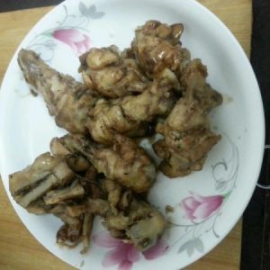 将煮熟的鸡腿放入锅中,倒入可乐一听,等收汁即可取出放入盘中