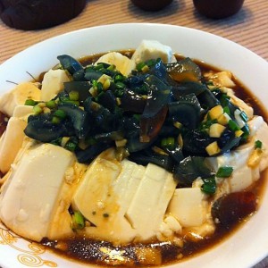 内脂豆腐用凉开水冲洗下,码在盘中,用刀划成片;