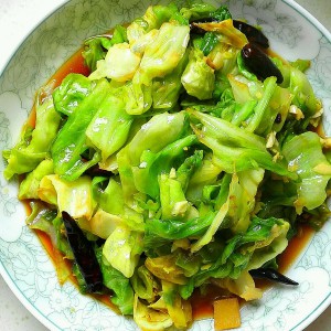 白菜撕成小块,锅中热油,放干辣椒炸变色,放入葱姜沫,放白菜炒!