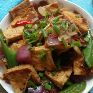 把洋葱,姜,蒜,辣椒炒到半熟,加入煎好的豆腐