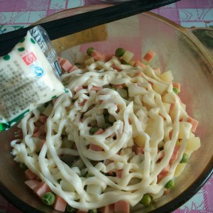 土豆~方腿切丁……土豆和豌豆分别加少许盐和味精煮熟~