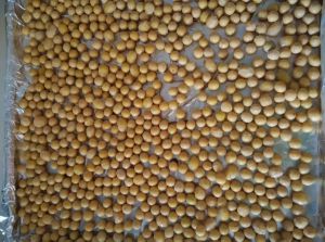 将黄豆捞出沥干,平铺在烤盘上,放在通风处晾干