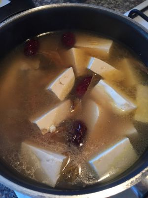 20分钟后加入豆腐,大火滚开之后转至小火继续煮10-15分钟,放入适量的盐,关火焖10分钟
